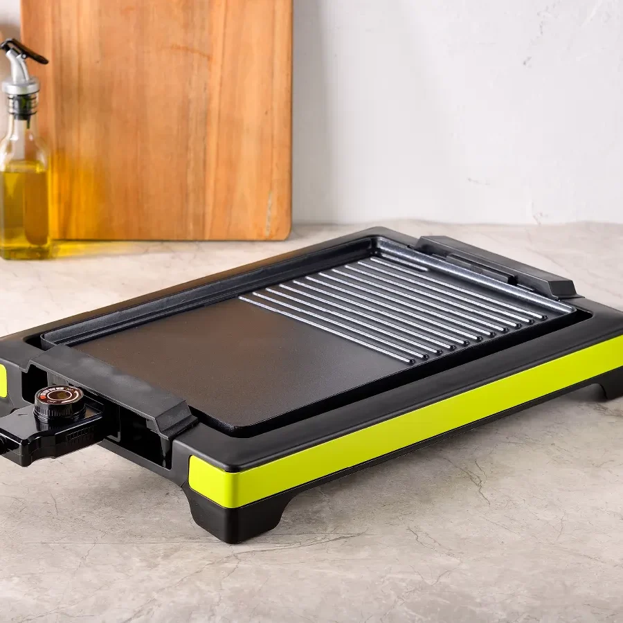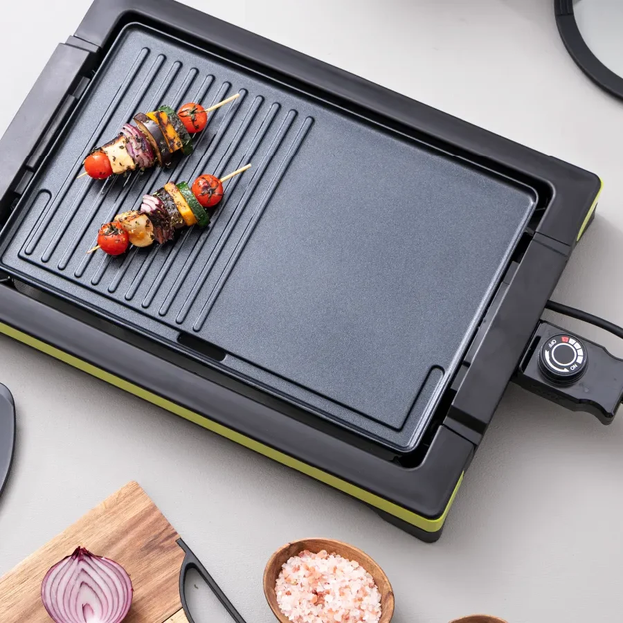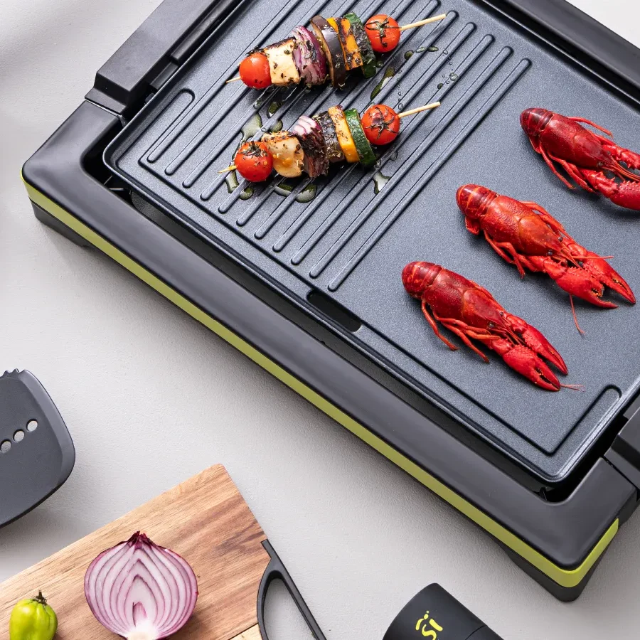 Parrilla eléctrica de 2000W de potencia, cuenta con una placa recubierta antiadherente para que puedas cocinar cómodamente y con poco aceite. Fácil de limpiar incluso en lavavajillas.