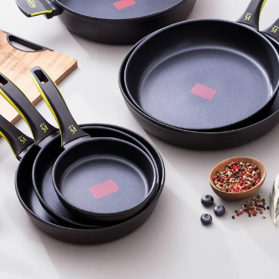 Sartén disponible en 16, 20, 24, 28 y 32 cm, fabricada en aluminio forjado de gran durabilidad y resistencia. Gracias a su superficie antiadherente y a su indicador de temperatura Heatdot, este juego de sartenes será tu gran aliado en el día a día.