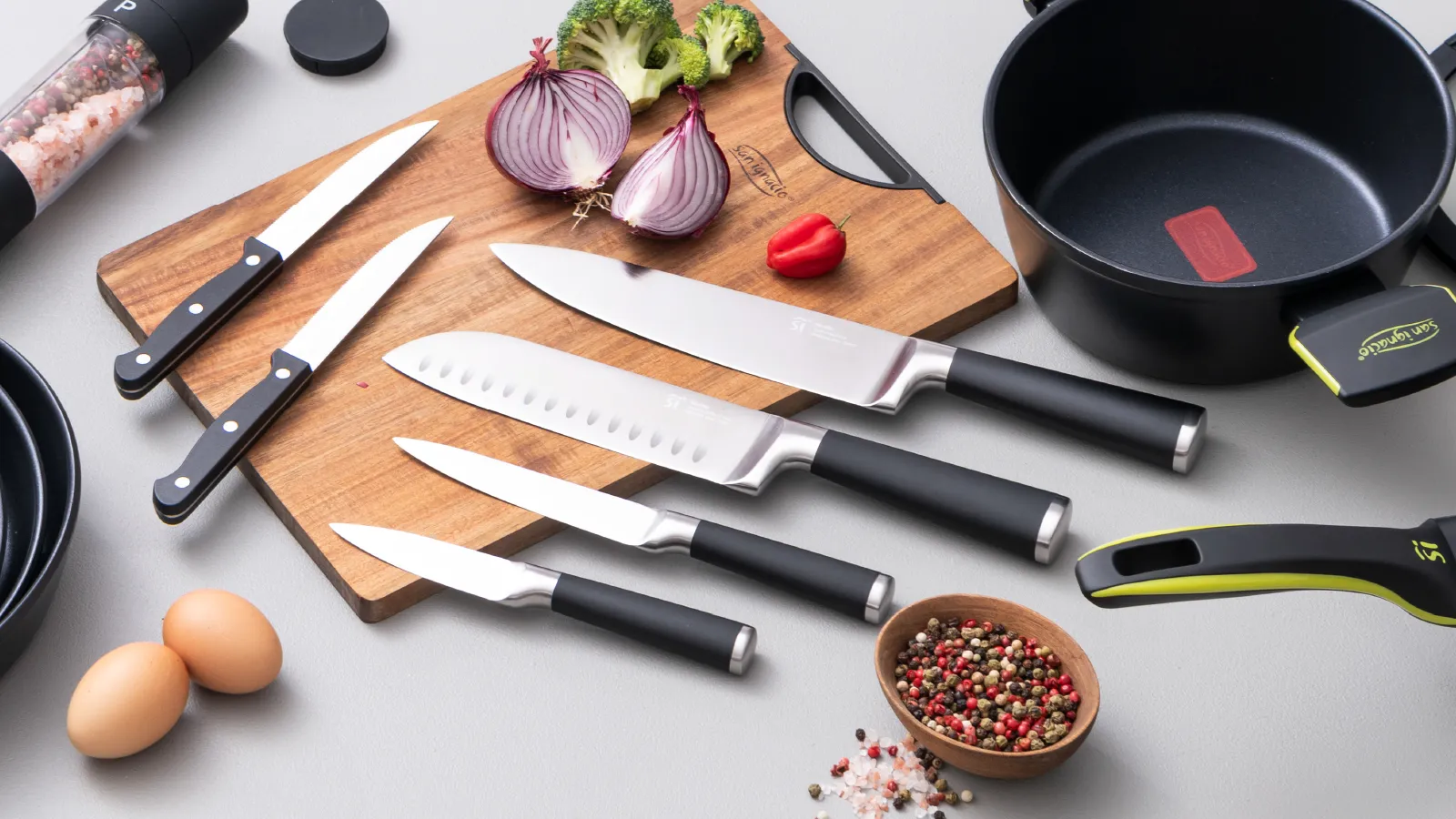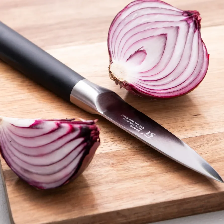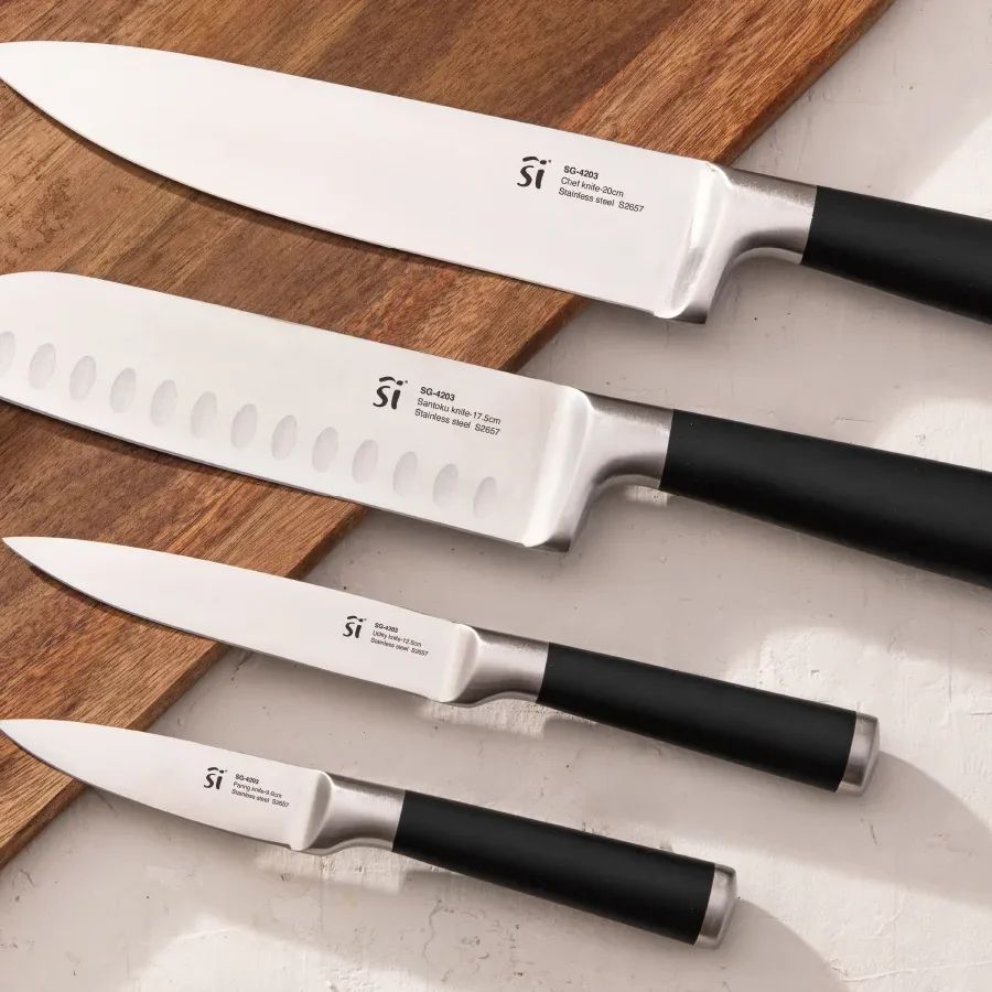 - Juego de cuchillos de 4 piezas: 1 cuchillo cocinero de 20 cm, 1 cuchillo Santoku de 17.5 cm, 1 cuchillo multiusos de 12.5 cm y 1 cuchillo pelador de 9 cm.