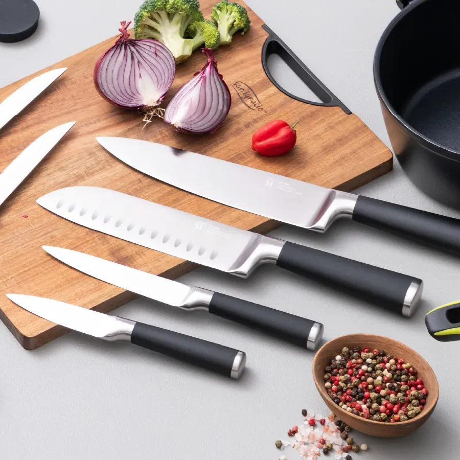 Cada cuchillo, confeccionado en acero inoxidable de alta calidad, garantiza durabilidad y un rendimiento excepcional en la cocina. Desde cortes precisos hasta picados finos, estos cuchillos son herramientas indispensables para cualquier cocinero aficionado o profesional.