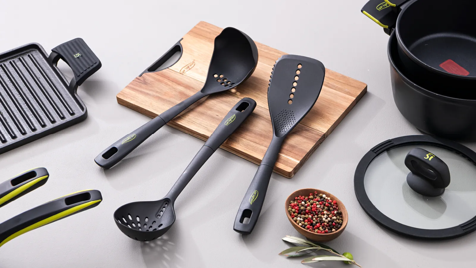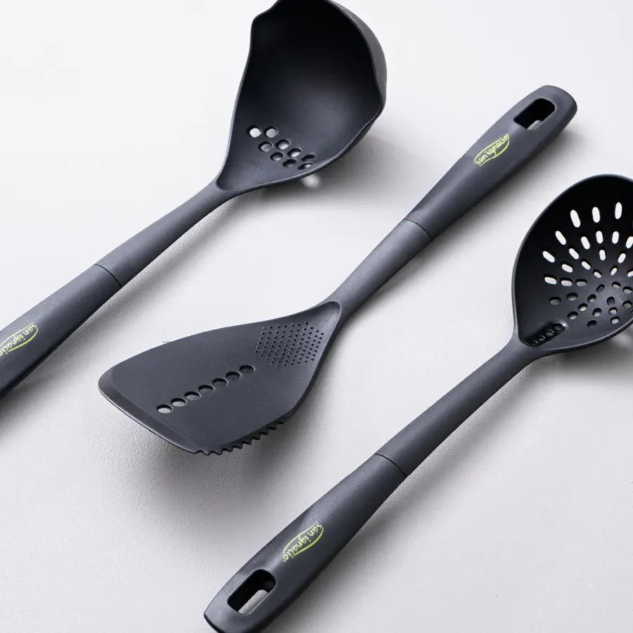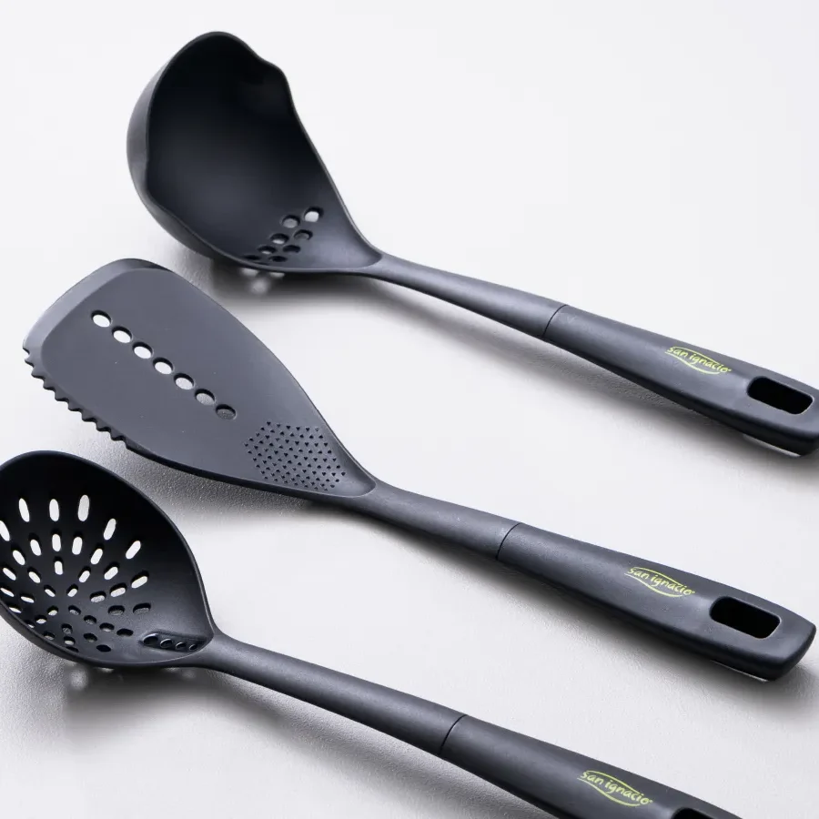 El set de utensilios de cocina de la colección Xtra de San Ignacio está compuesto por los tres utensilios indispensables en cualquier cocina: 1 cuchara ranurada, 1 espátula ranurada y 1 cuchara de mesa. Ligeros, ergonómicos y resistentes, te ayudarán en todas tus preparaciones ofreciéndote un agarre cómodo, ergonómico y seguro, pues resisten temperaturas de hasta 210º C.