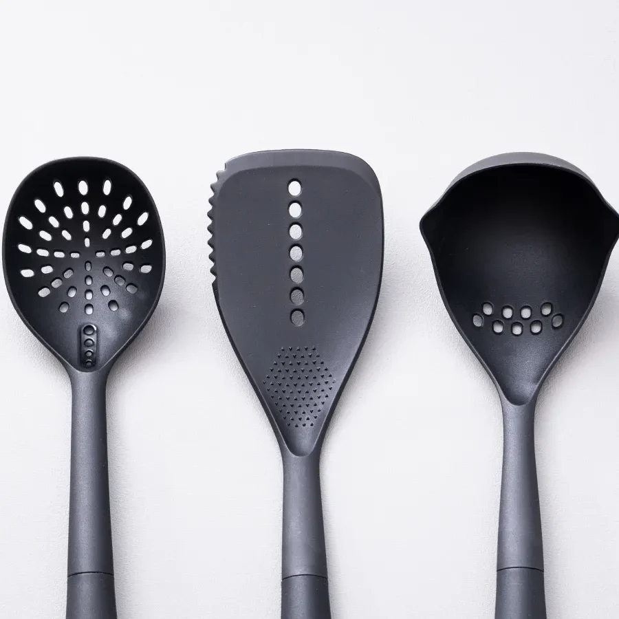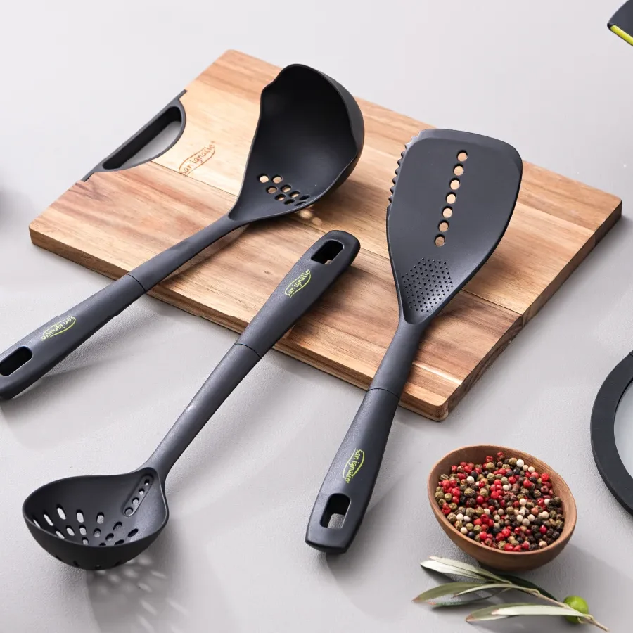 Set de tres utensilios de cocina fabricados en PBT antirañazos, resistentes a temperaturas hasta 210ºC. Compuesto por cuchara de mesa, espátula y cucharas ranuradas. ¡Imprescindibles en el día a día!